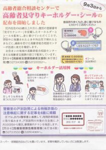 ご高齢の方が外出先などで倒れた時などに、医療関係者等がキーホルダー記載の高齢者総合相談センターに連絡することで、身元確認が出来るというものです。