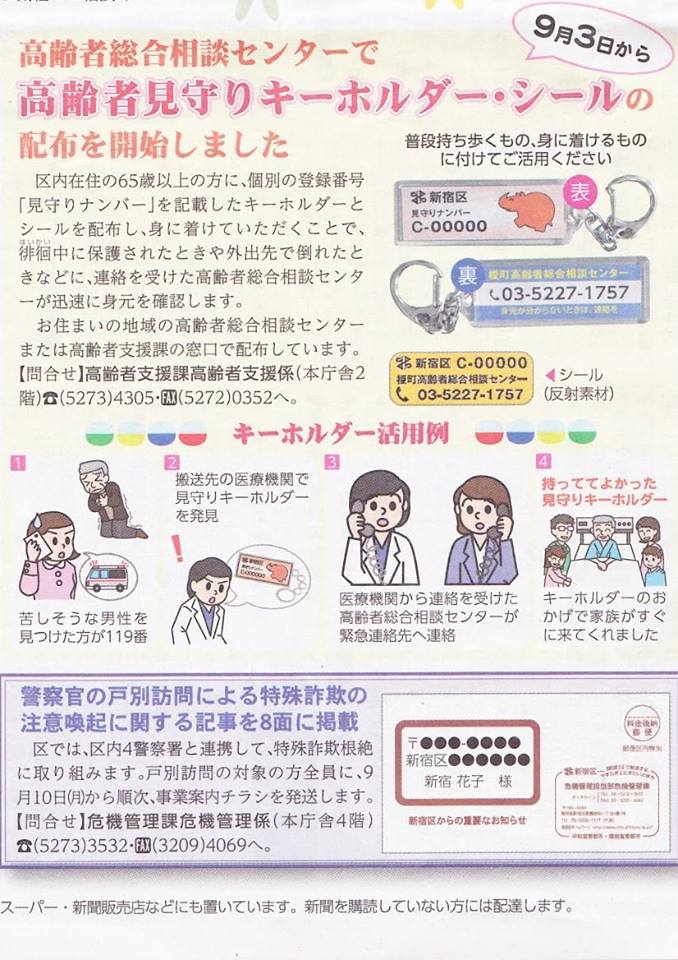 新宿区では、9月3日より区内在住の65歳以上の方を対象に個別の登録番号を記載した「高齢者見守りキーホルダー・シール」の配布を開始しました。(窓口での申請が必要)
